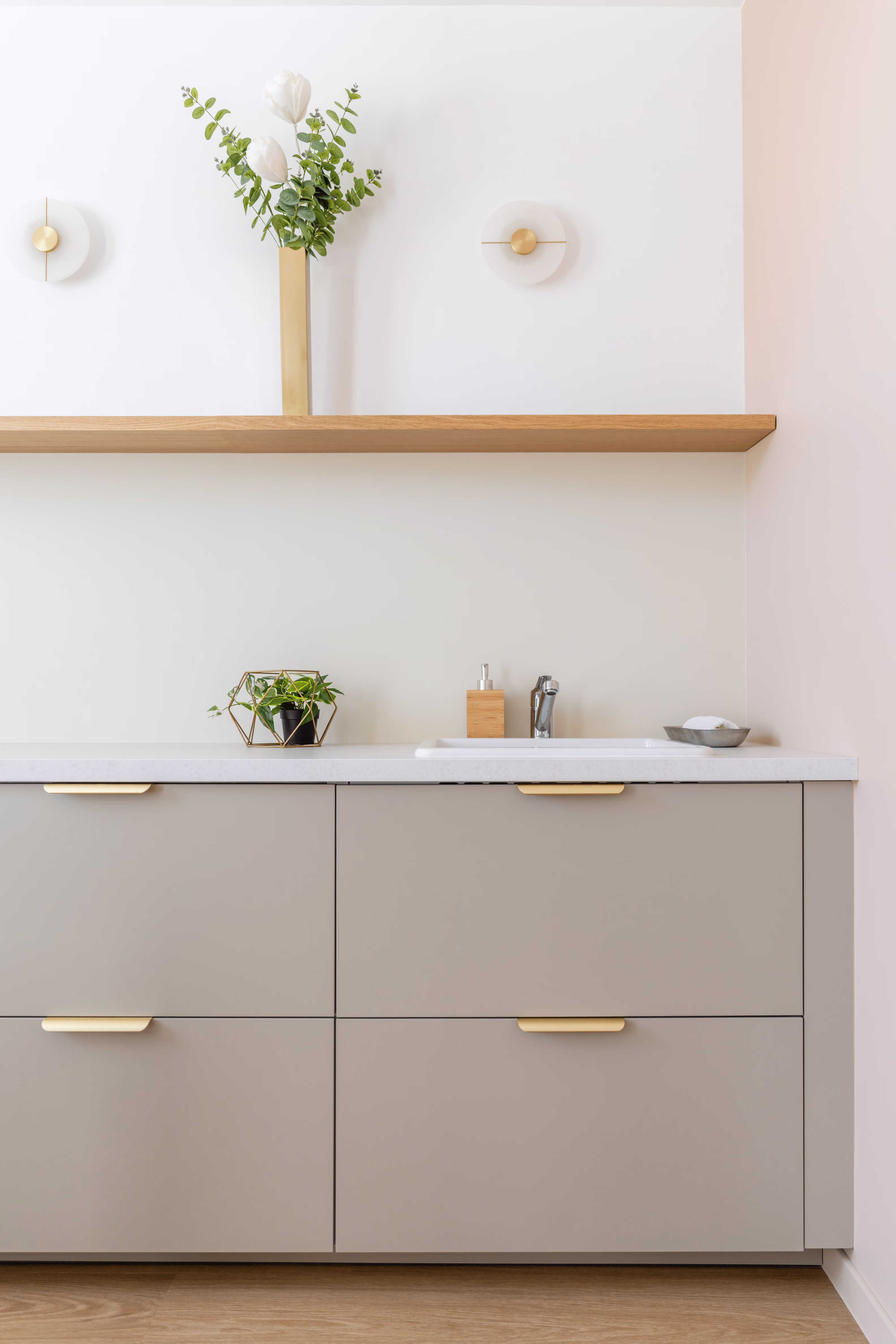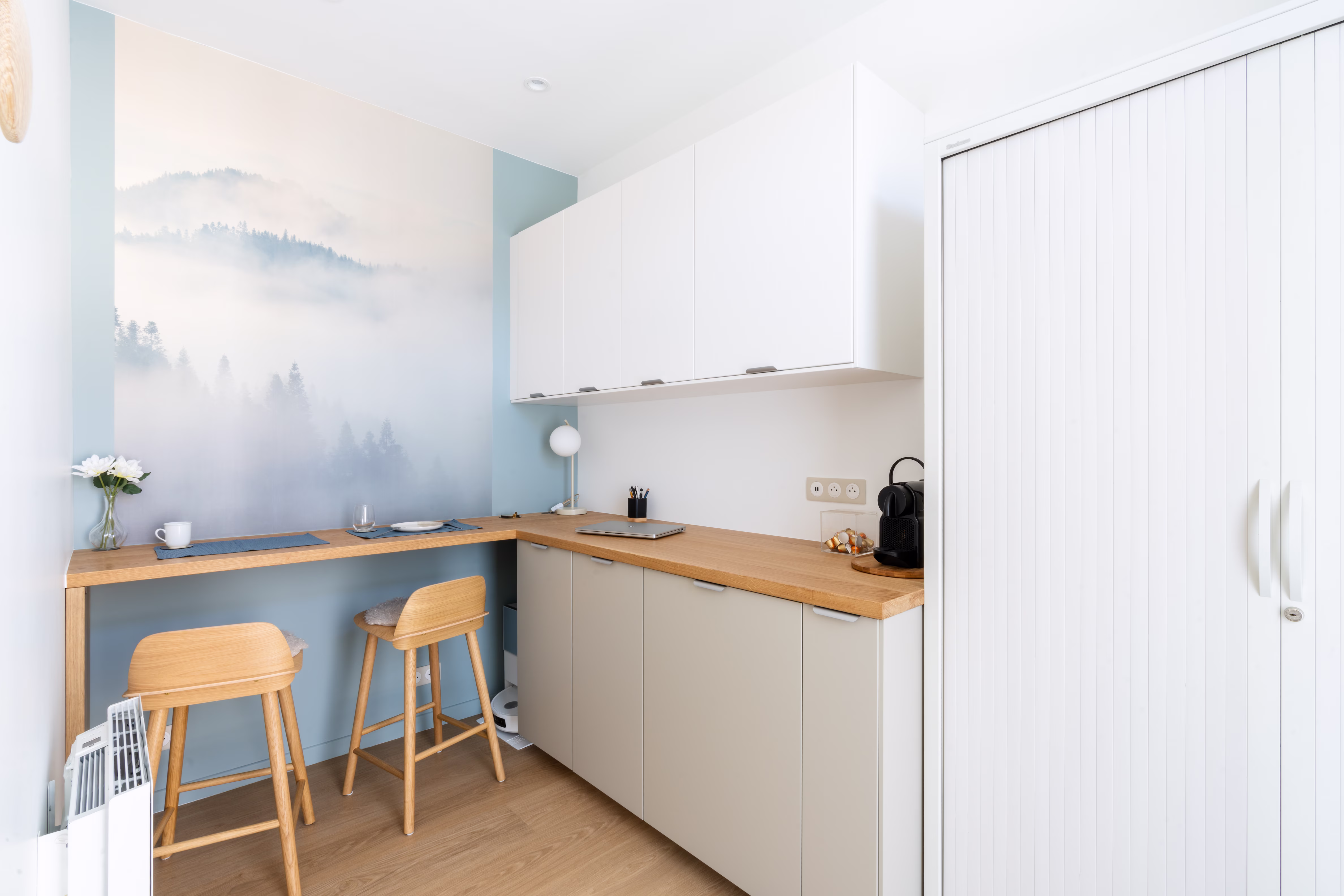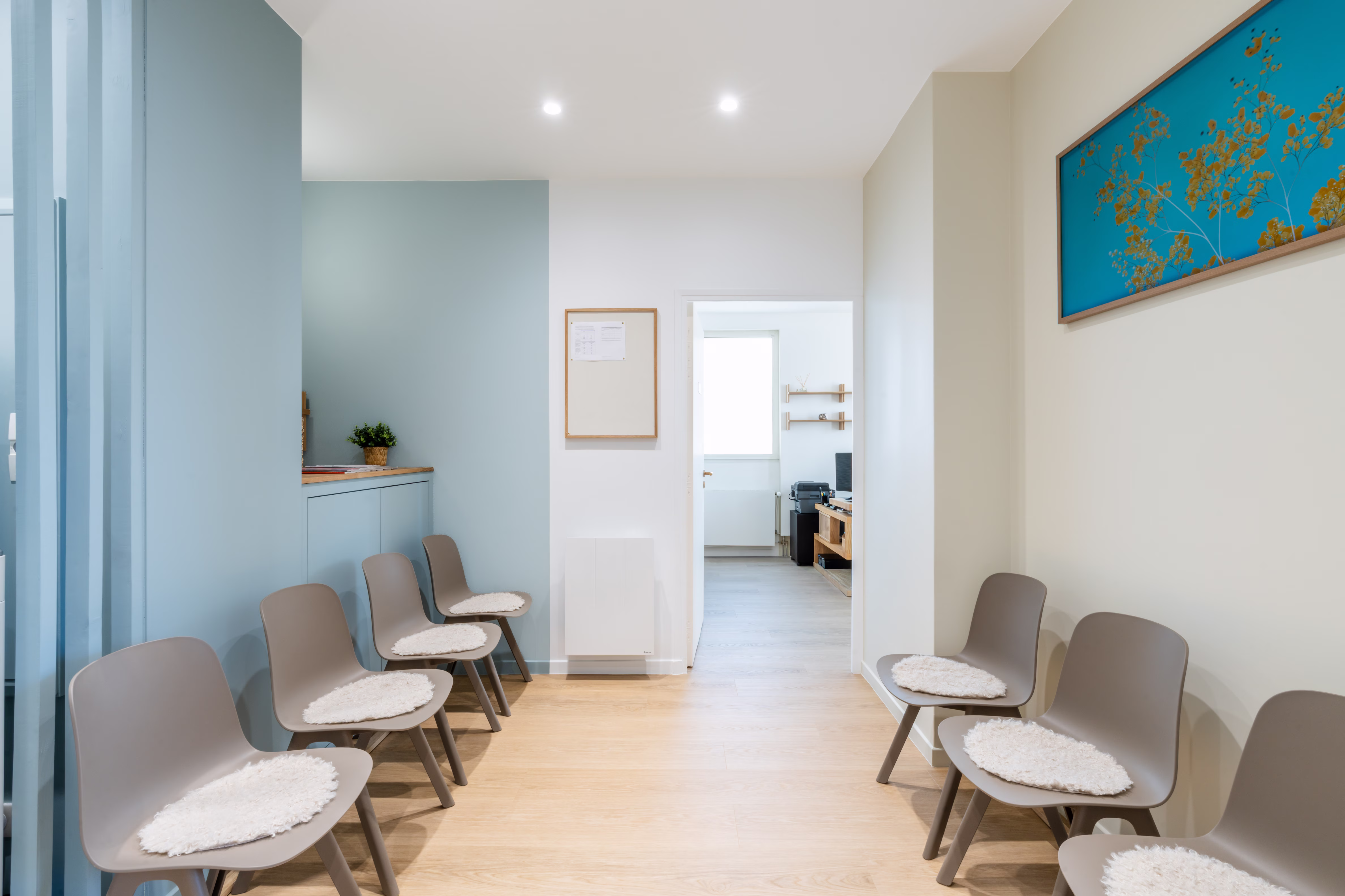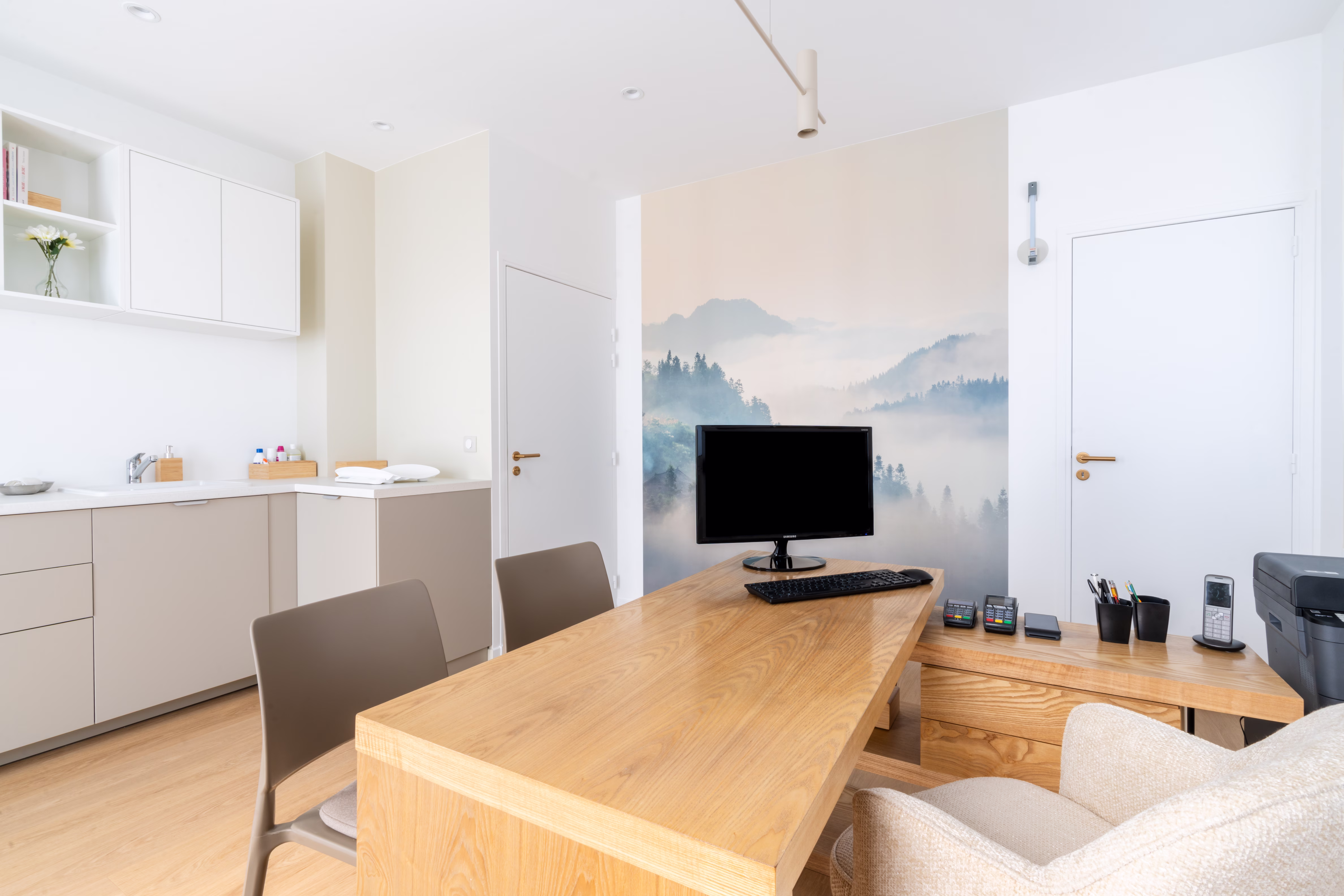 Ainsi, nous avons sélectionné et décliné une palette de couleurs neutre, douce et singulière, avec une touche de couleur bleu gris, pour une sensation zen et chaleureuse à la fois. Dans l'un des cabinets, un papier peint d’inspiration panoramique vient structurer l'espace. Une finition en chêne naturel au sol et sur le plan de travail de la salle de repos apporte une convivialité toujours bienvenue.
