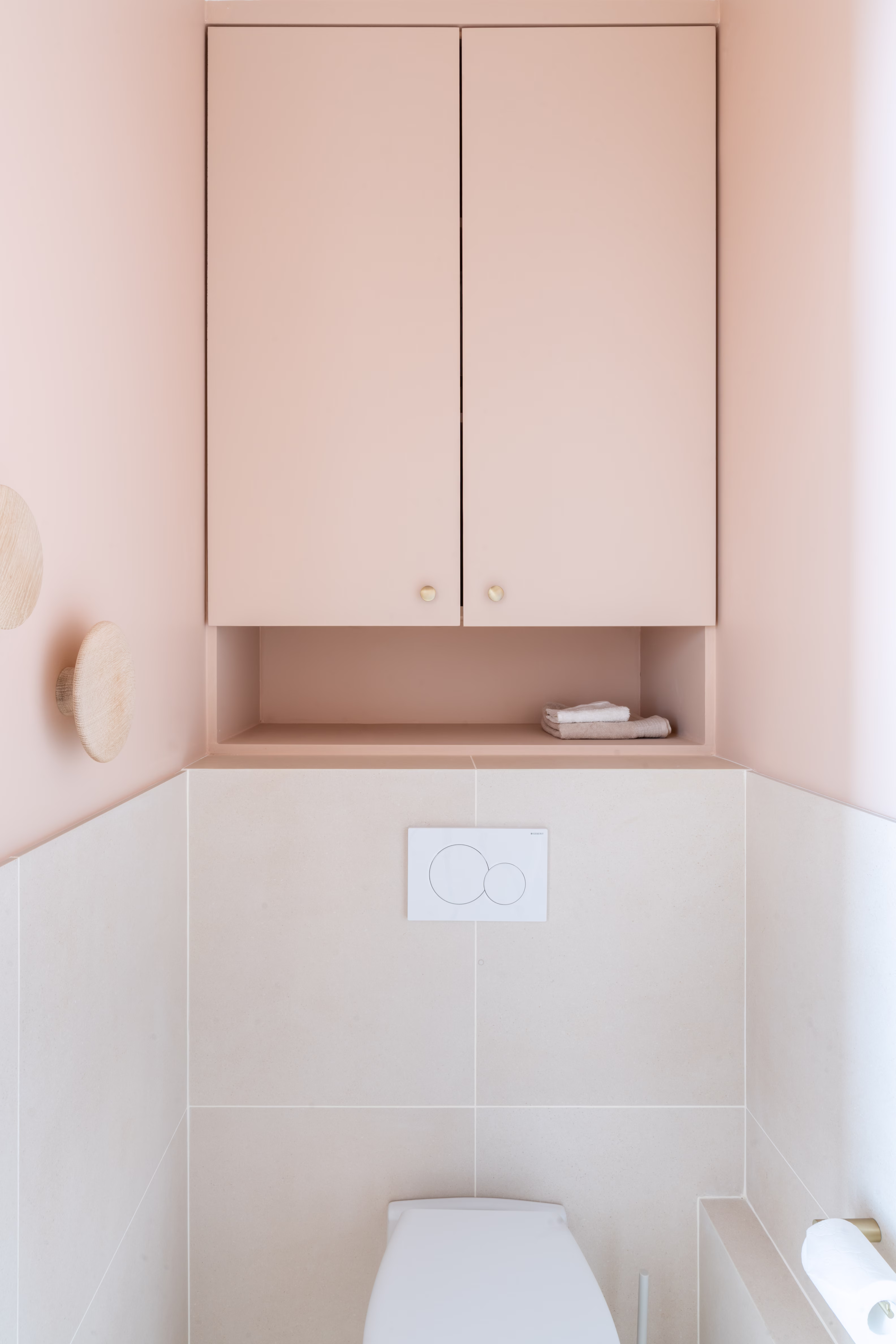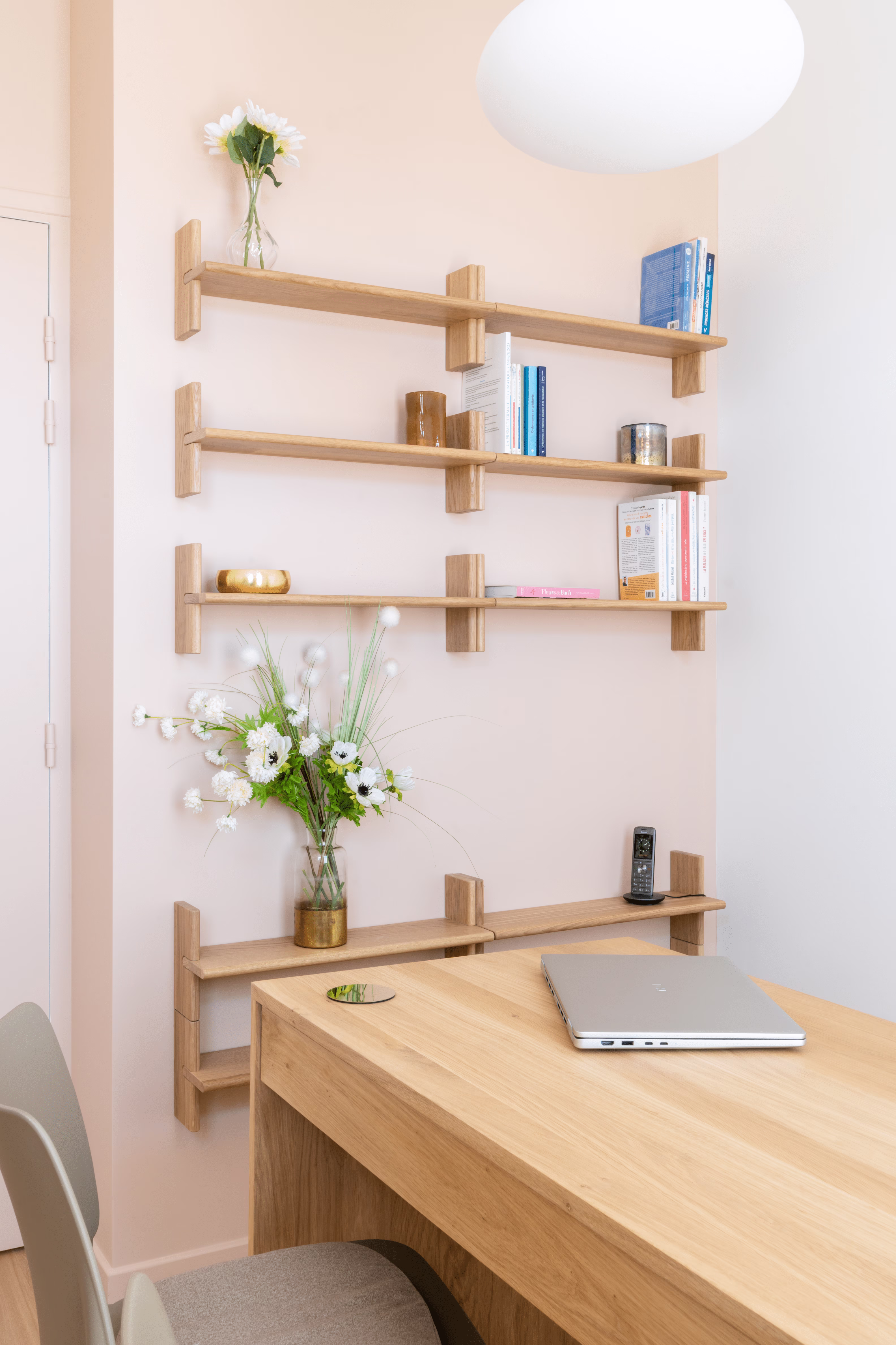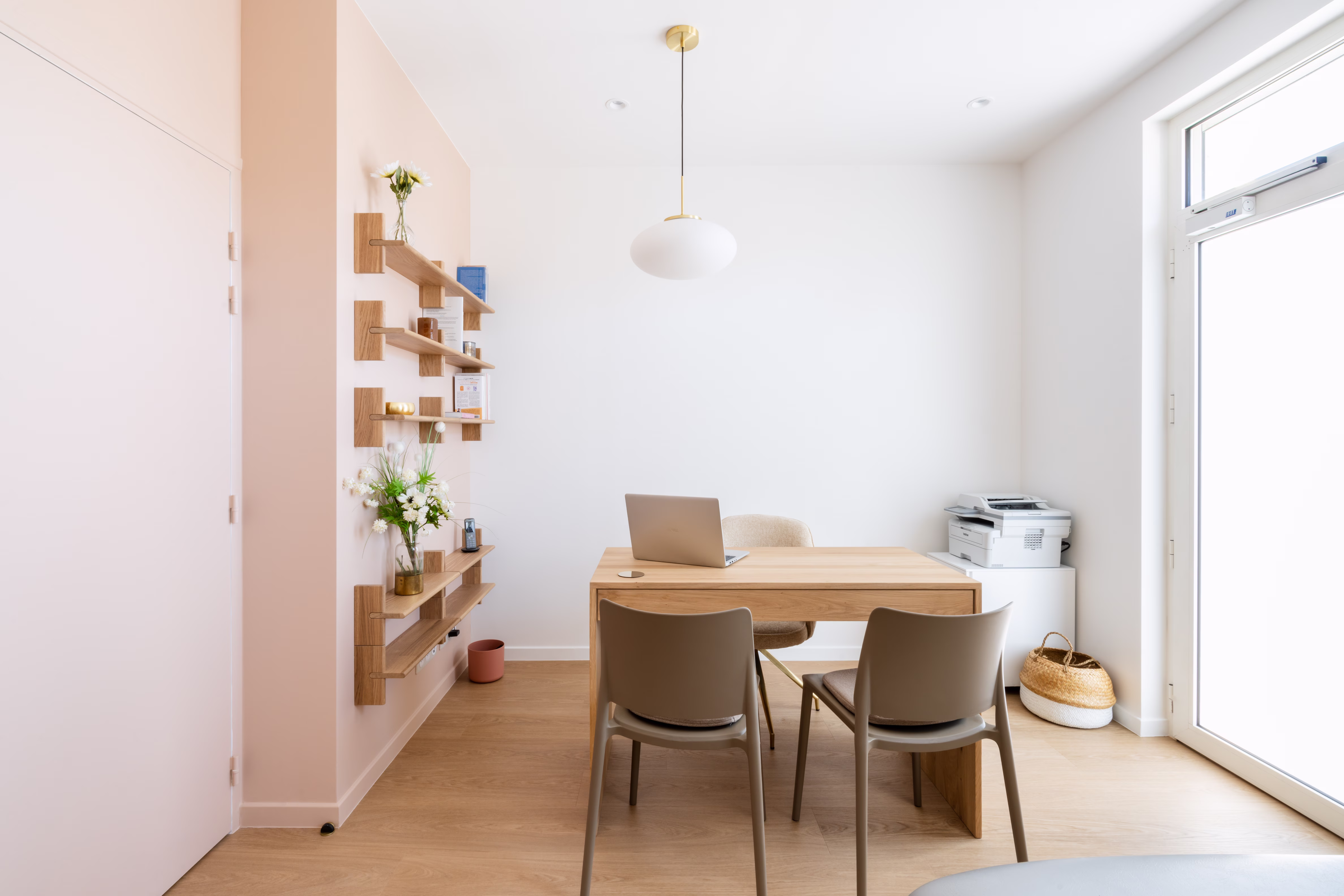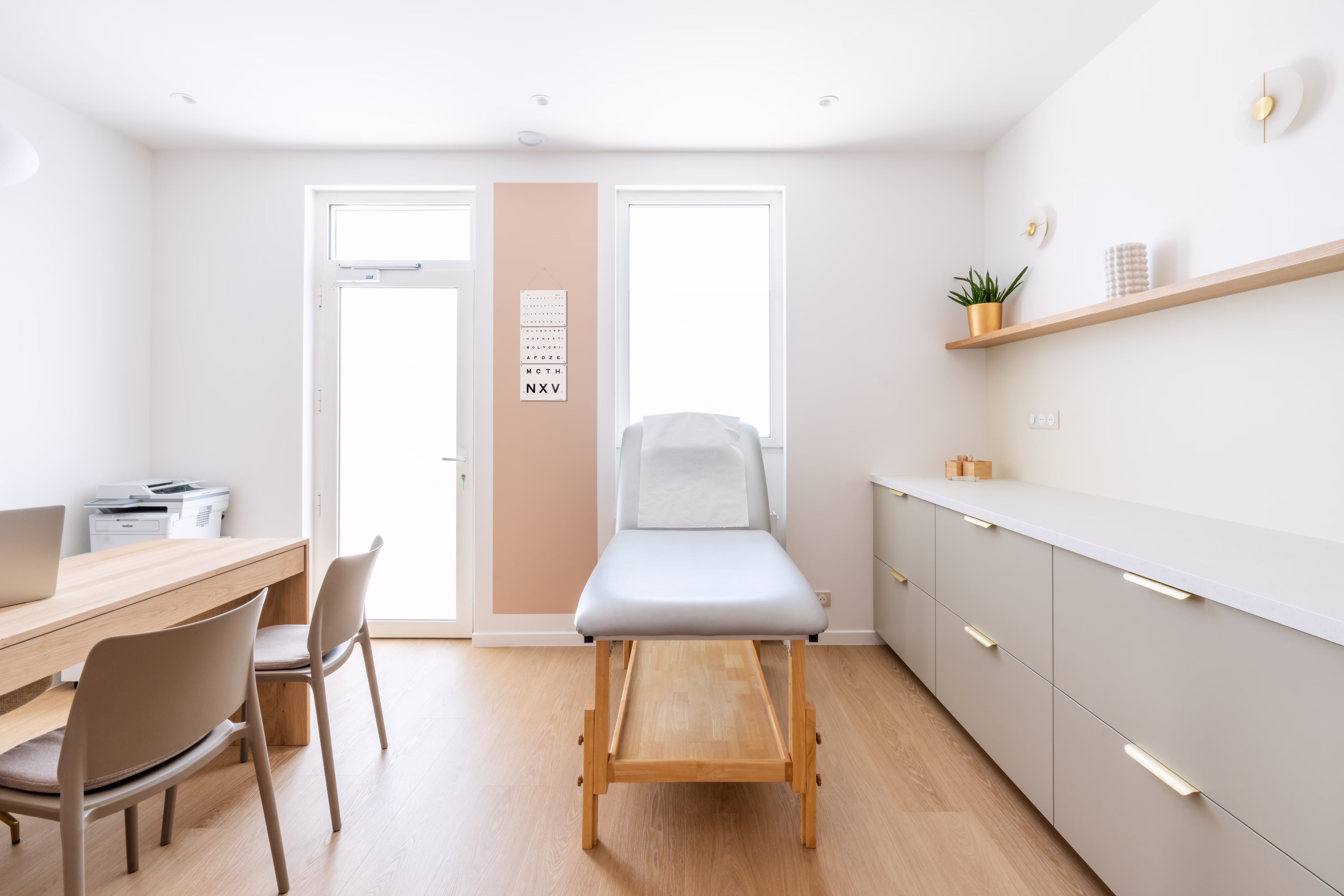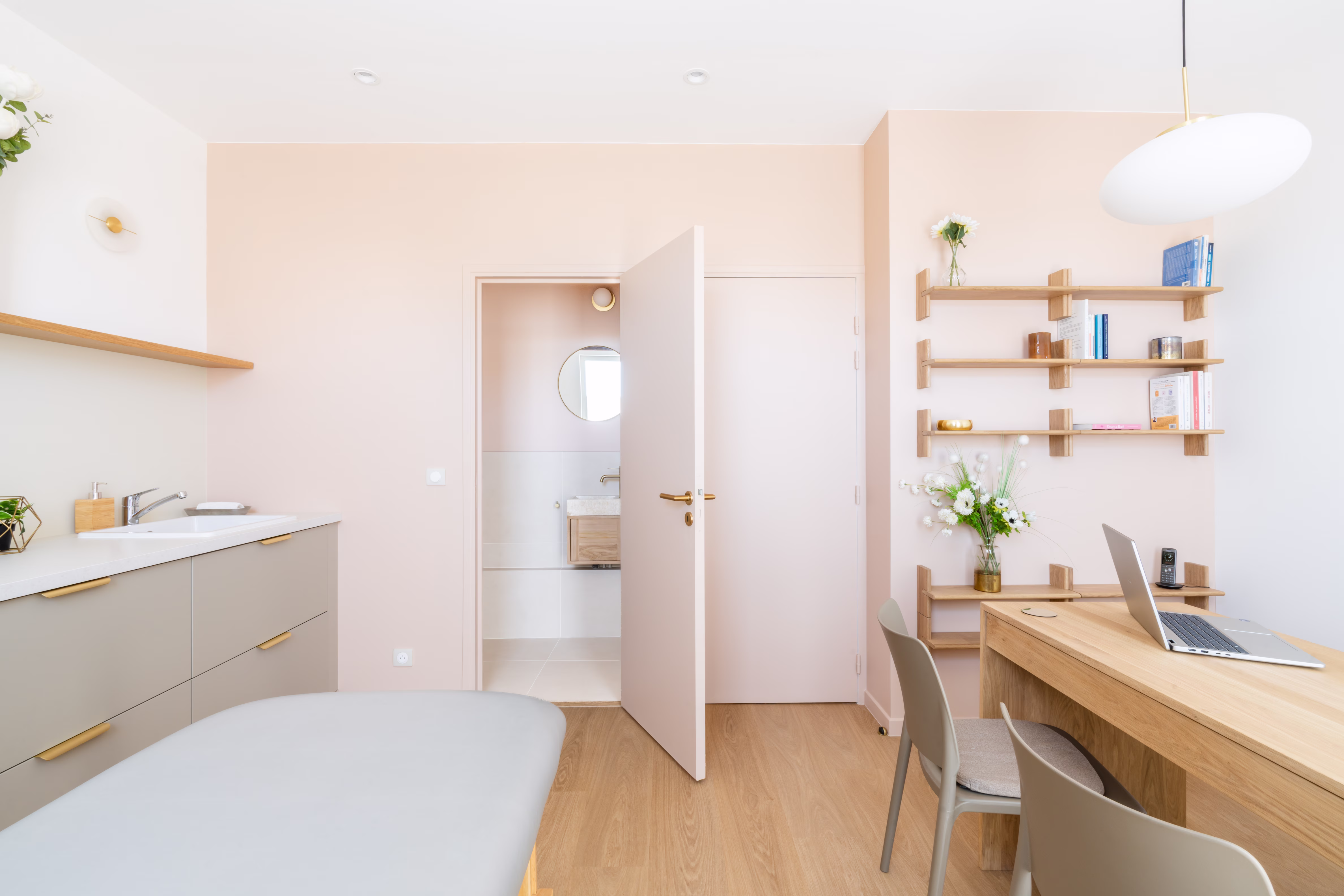 Le second cabinet joue davantage encore la carte de la douceur avec une palette de beiges, rose pâle poudré et chêne. L'atmosphère épurée favorise la concentration pendant les consultations médicales et l'apaisement des patients.